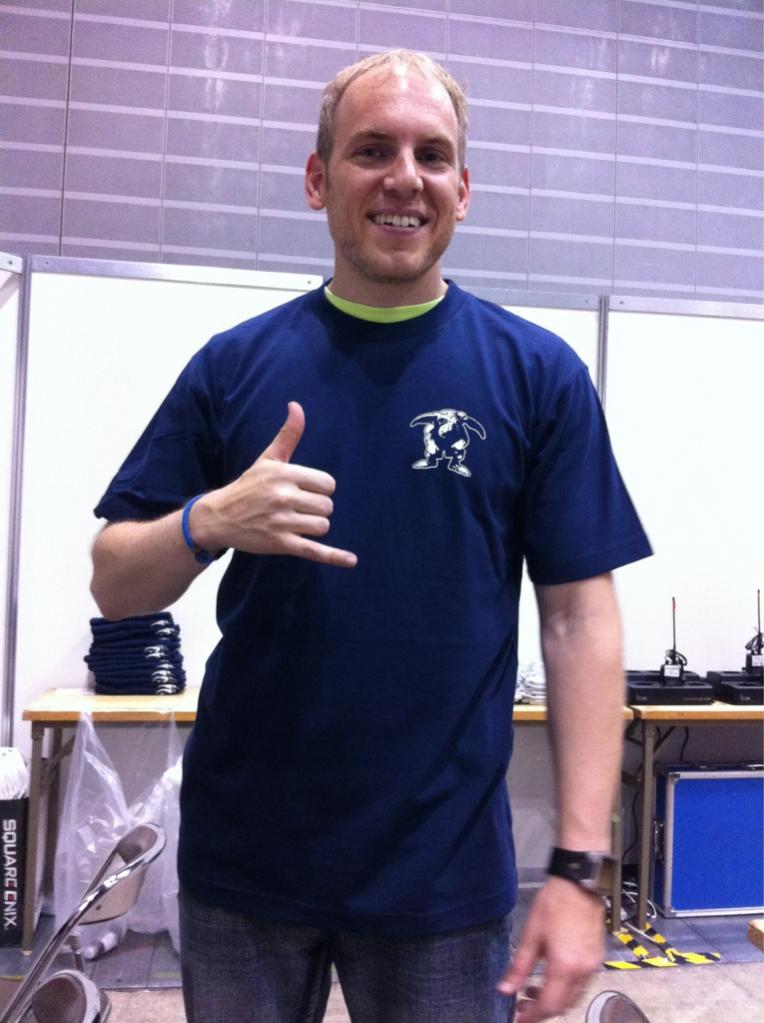 Camate tries on his VanaFest staff shirt while working in the staff area. So stylish!