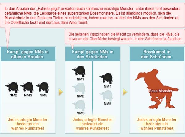 Bei der Fährdenjagd handelt es sich um einen kampfbasierten Spielinhalt, bei dem die Spieler ein mysteriöses Höhlensystem, das „die Schründe“ genannt wird, erkunden und die dort hausenden notorischen Monster besiegen müssen, um anschließend eine epische Schlacht gegen ein extrem starkes Bossmonster zu schlagen. Dabei handelt es sich um einen Spielinhalt, der sich an Spieler richtet, die ihr Können bereits bei zahlreichen Scharmützeln und Reviervorstößen unter Beweis gestellt und Level 99 erreicht haben.
