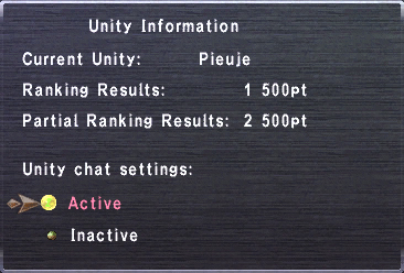 The Unity Info section displays the entry shown below. Players can check their Unity's ranking and select whether or not they would like to participate in Unity chat.Attachment 10677