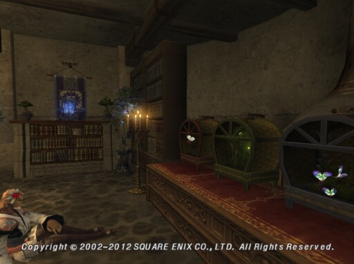 Hello, and welcome to my moghouse on Ragnarok. I wanted to create something that would bring my favorite place (the jungle) indoors and that would also show a hint of the hunters' aura. Complete with a hammock, stockfish and display blades, there is a collection of my pets which I have gathered from the hot jungles of Yuhtunga and Yhoater. The sound of chirping crickets I can't get enough of- while glowing fireflies, Totem poles, Elshimo palms and pachira remind me of the hot summer days and evenings - all year 'round.