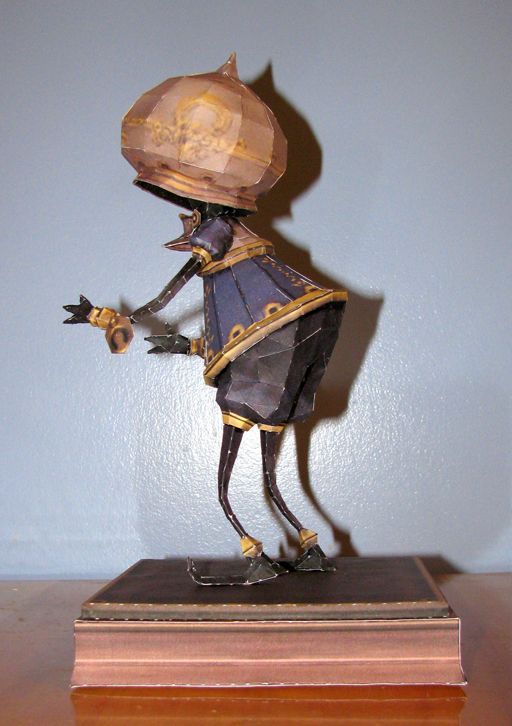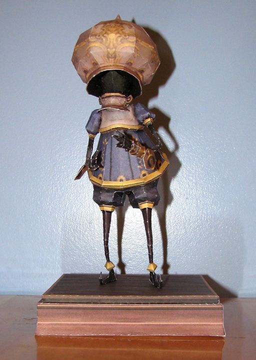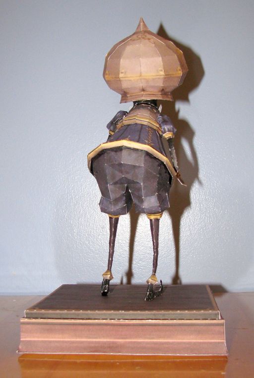He stands about 35 cm tall (stand included) and not including fixing up the 3D model took about 3 days and 20 sheets of card stock to assemble. His mask is magnetic so his hat and mask can be removed. Larger pictures can be found here, and if you're crazy enough to want to make your own the files can be found here.