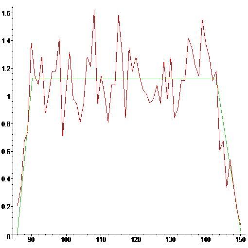 Since I had so low def I assume that their pdif is largely above 1.5 (clearly no spike at their wpn DMG=66 since it is out of the range). Here is a graphical comparison of theorical distribution (green) and data (red).