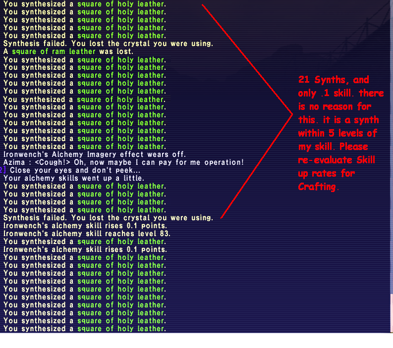 there is no reason for this. please re-evaluate the higher end skill up rates on Crafting skills. there is no reason i should craft an item 20+ times to only see a .1 skill when it is within 5 levels of my current skill.