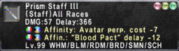 Again, same for eight Summoner's Elemental III Staves into one multipurpose Avatar Staff which lowers perpetuation -7 and bloodpact timers -12, regardless of avatar's elemental affinity.