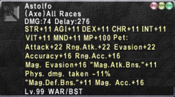 The same would be true for all eight Tuahjebat Staves, Astolfo Axes, Oxyuranis H2H, they could potentially concentrate all similar stats together, for example MP+100, Pet: Atk +26/R.Atk +26, Eva +26, Acc +22, M.Eva +22, MAB +13, PDT -13, M.Def +13, M.Acc. +22.