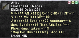 Just in the same likeness, have a Shikargar, Arisui, Thokcha, Etc all containing STR +11/Atk +22, AGI +11/Eva +22, DEX +11/Acc +16, CHR +11/M.Eva +16, INT +11/MAB +11, VIT +11/PDT -11, MND +11/M.Def +11, MP +100/M.Acc +16.