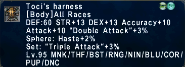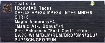The only advantage the RDM body has, is the STP. It has 3 more attack, but thats made up for by the 3 more STR Toci's has, Toci's also has DEX, something for 1 of our best WSs on Sword, and the best non-Relic/Merit Dagger WS for RDM as well. Not to mention the accuracy+10 along with it, something RDM needs for melee. The head is another case for this same set, RDM was left out, alot of STR on it, has a set bonus with a great body, and is one of the best Haste pieces, I would surely use it over Zelus if given the choice. The list goes on however, there is Athos and Thaumas as well, not to mention I'm sure there are even more pieces of gear that don't come to mind right now, but RDM is left off of them. The majority of the high end gear sets that RDM is put on is mage only gear, like...