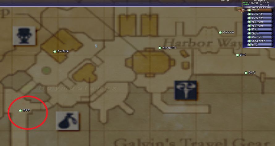 However, something odd occurred when I went to Port Bastok for some quests. There was a green marker already set by the game (you can't manually add green markers, only purple ones), and it was there before I'd ever spoken to the AMAN NPC for quest markers. I have no idea how it got there. It was named "???" and it was by the zone to Bastok Markets to the west. However, as I went there to inspect, there was nothing, only the usual Galkan NPC who tells you that the zone to Bastok Markets is there.