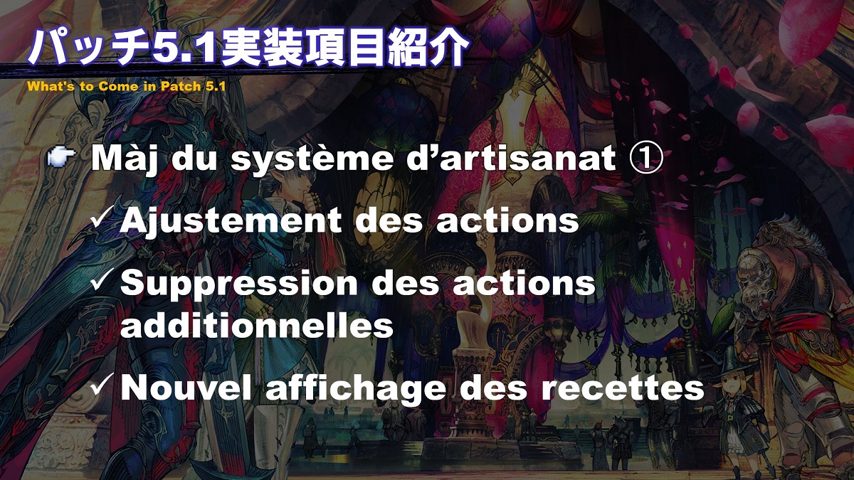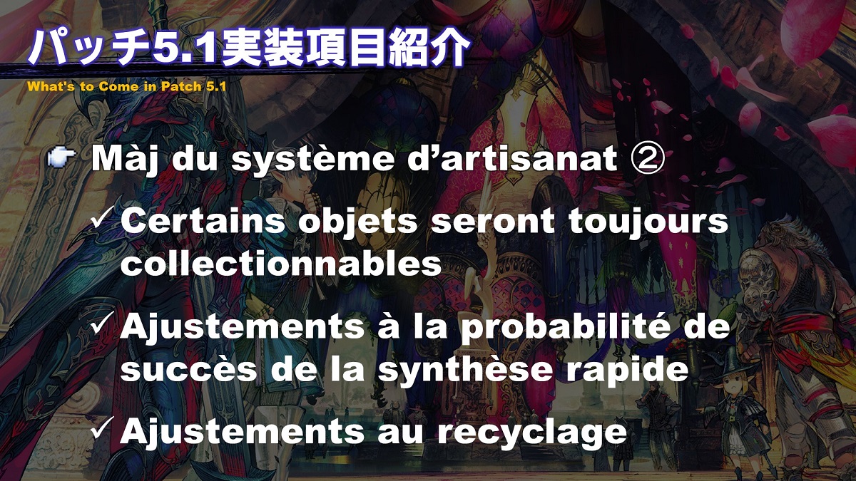 En tant qu'artisan, vous trouvez peut-être que réussir une recette en haute qualité est relativement facile, et nous pensons nous-même que les actions d'artisanat ne sont pas très équilibrées à l'heure actuelle. Lors des màj 5.1 et 5.2, nous ferons donc des ajustements afin que ceux d'entre vous ayant optimisé leur équipement soit récompensés à hauteur de leurs efforts.