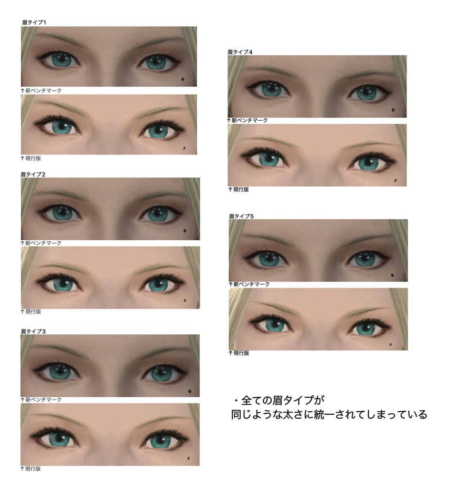 現行版と同じ太さに修正するか、またはスライダー等で現行版と同じに調整できるようにする、または眉パーツを増やすなどでご対応をお願いいたします。