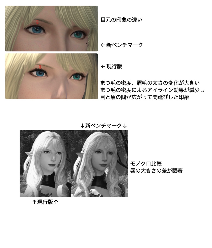 PS5のためベンチマークをためせないのでフレンドにお願いしている状態で、唇の色などはいじれていないのですが、上記2点の違和感のせいで、気に入っていた柔らかくあどけない印象がかなり減り、顔全体が不自然なほどくっきりしてしまったと感じました。