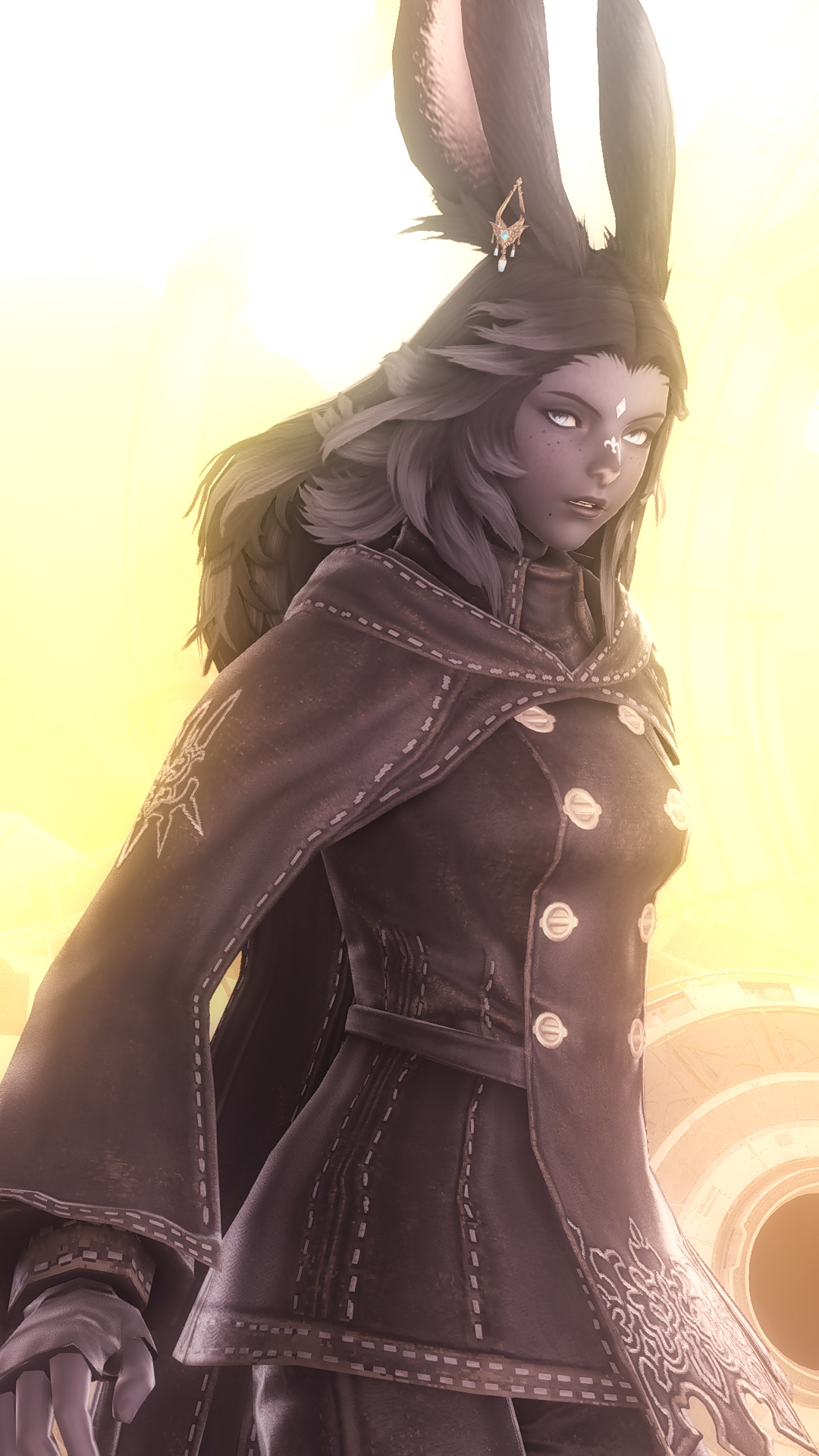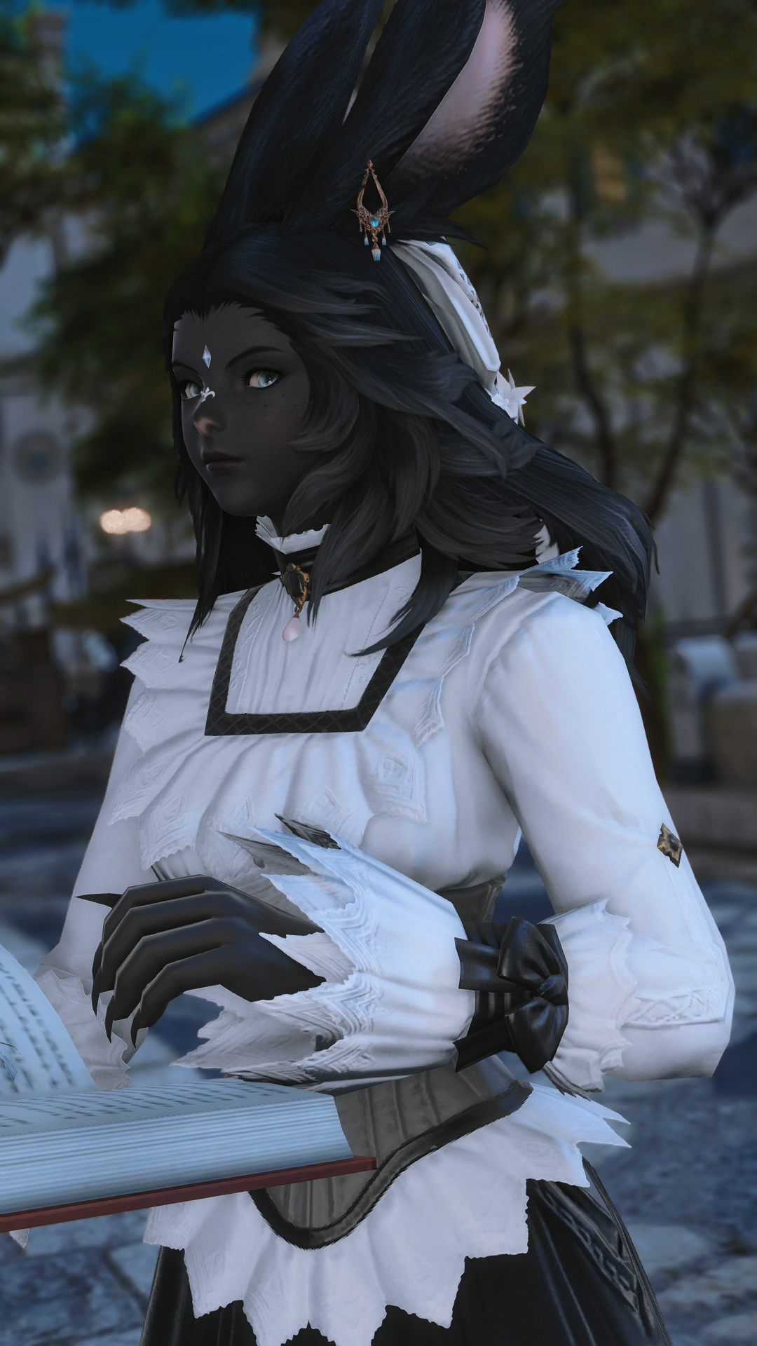 I just say it how I see it. I see a lot of generic viera (I am a part of the problem whenever I'm a viera). You are using a lesser used face, and I almost NEVER see grey skinned viera. It looks surprisingly great on them. The tattoos with that face along with the white face paint (freckles), plus the light hair color - all matching - make it a wholly unique look. I'd describe your viera's look as like, a moon viera. Looks great!