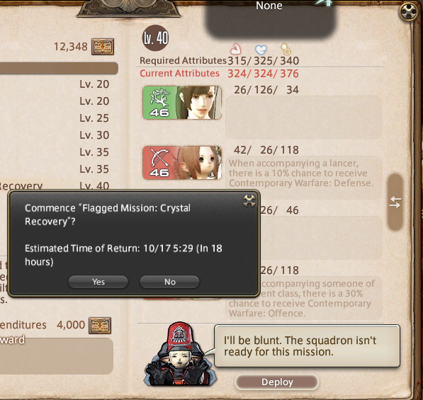 Tuning is something you do that doesn't require a RNG based boost, such as gear builds and stat allocation. Something we can't do in squadrons, we are entirely dependant on RNG in this case, yes we can switch out members, but again you can't take a GLD and apply individual points into their mental, physical, or tactical, nor can I add gear to said member to help curve the stat requirements. The only thing you can do is be entirely dependant on RNG and in this case MihaelB's squad mathematically had a 66.6% chance of winning with a 33.3% chance of failure based purely having 2/3 requirements. But if you actually add up the total stat requirements for crystal recovery you need 980 total across the board, 315 + 325 + 340= 980 and MihaelB has 1024 total, 330 + 324 + 370= 1024. For the game to determine that squad isn't ready despite the glaring fact Mihael is over stated in 2 categories, is something that needs to reconsidered.