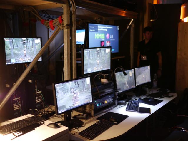 吉田Pがステージ上でプレイしているのは既にご覧になったと思いますが、ステージ裏では3名のスタッフがパーティメンバーキャラを操作しており、ライブデモ中に4人パーティを編成しています。ちゃんと現地(ドイツ)で操作しているのですよ!