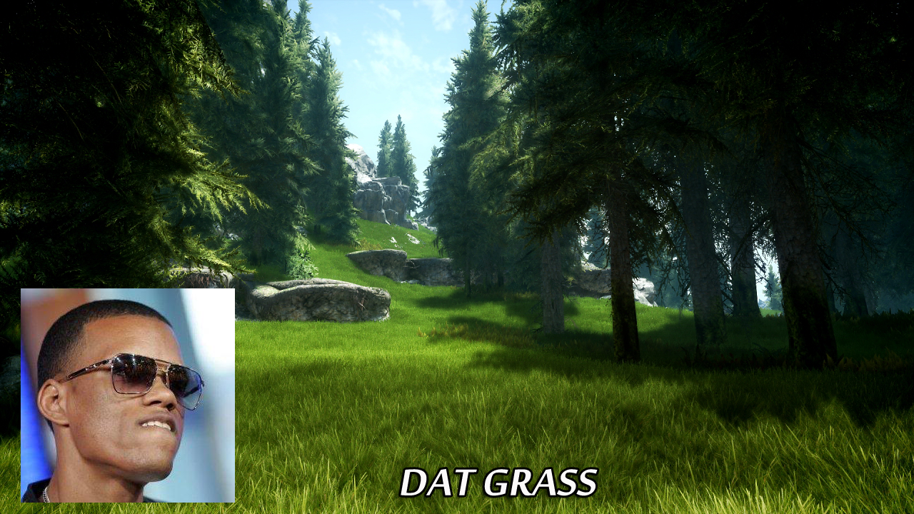 What good ol' Totilo doesn't tell you (because he has no idea, it's a tradition of Kotaku to write on what you know nothing about) is that the overall smooth effect has really nothing to do with the grass itself, but with the fact that the person in question is using an extremely powerful (and resource-hogging) ENB filter that smooths out everything at the price of performance and detail.