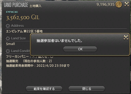 該当の土地を別キャラで確認すると「抽選参加者はいませんでした。」と表示されました。