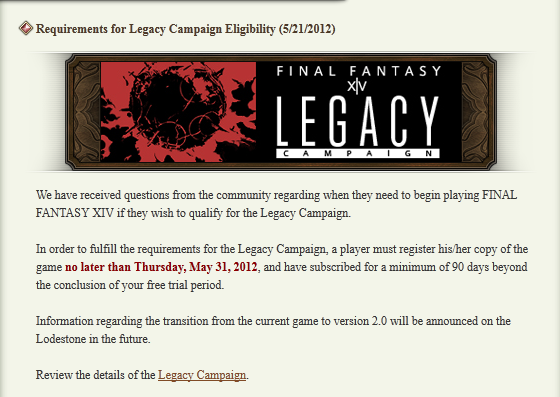 Ok, then they should warn new customers about the May 31st deadline ON THAT PAGE. There were a few of us that read that page and took what it said to be true. The fact is, that the Legacy Campaign details page contains detailed information that contradicts the May 31st registration deadline. http://static.finalfantasyxiv.com/pl...001.png?_v=8k0
