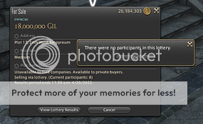 Winning number is zero for all 9 of our free company people who entered the same plot. Number generator is obviously broken and I hope you can fix this issue because we planned on moving to the new location TODAY.