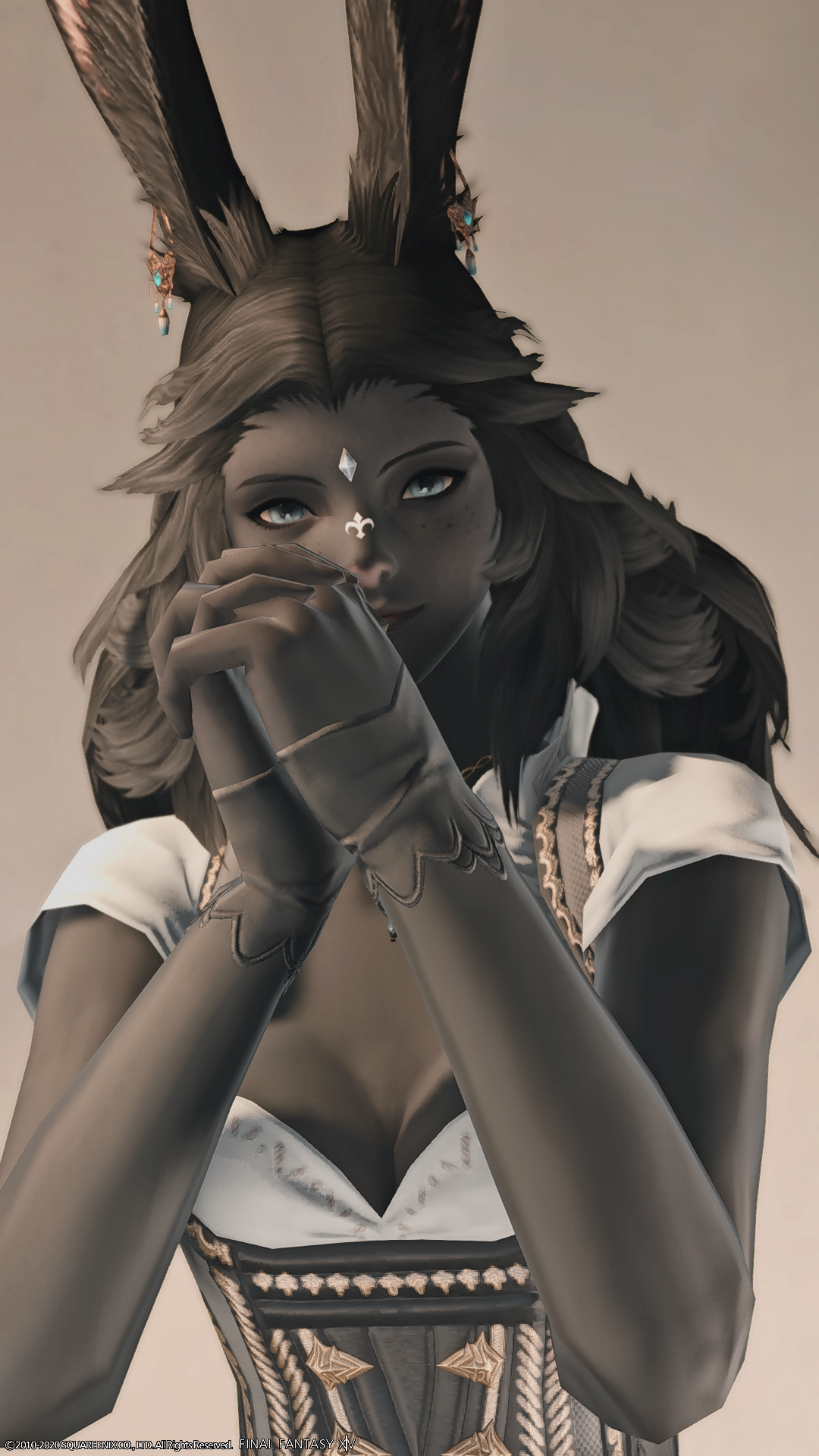 So far I'm loving it. :) There's something badass yet elegant about Vieras. I understand the discourse about the lack of hat options but that doesn't bother me too much. I guess it would be nice if some head gear were adapted eventually. The way I see it for now, the ears serve as their own 'accessory', and I hope to find lots of nice headbands to use. XD