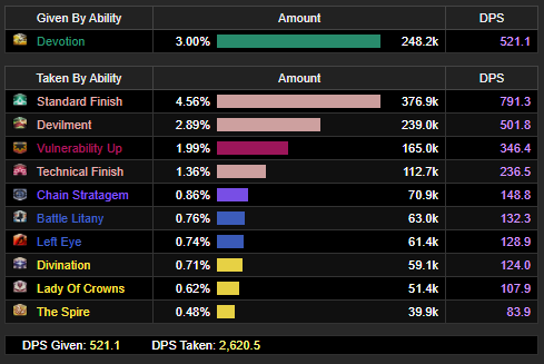 Honestly I'm taking the 200-250 from top smn numbers. Where their rdps and adps differences are only like 200 and their parties probably know what devotion actually looks like on the buff bar. My personal rdps and adps differences are usually maybe 100 and I know my team doesn't try and take advantage of it at all, i just do my best to line it up with trick so that we can do more damage.