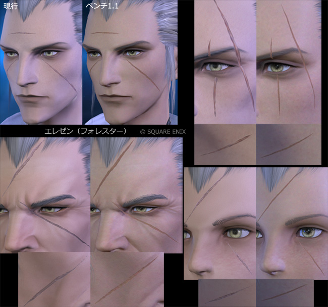 こちらは暁月の事件屋のムービーを新旧比較した画像ですが、影の落ち方で無骨な顔立ちになり、瞳は暗く、肌は過剰なテクスチャのせいで荒れ果てていて、自分の感覚では美しくなったとは思えませんでした。