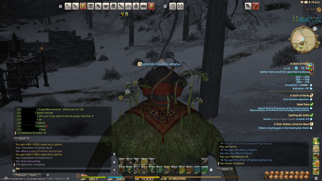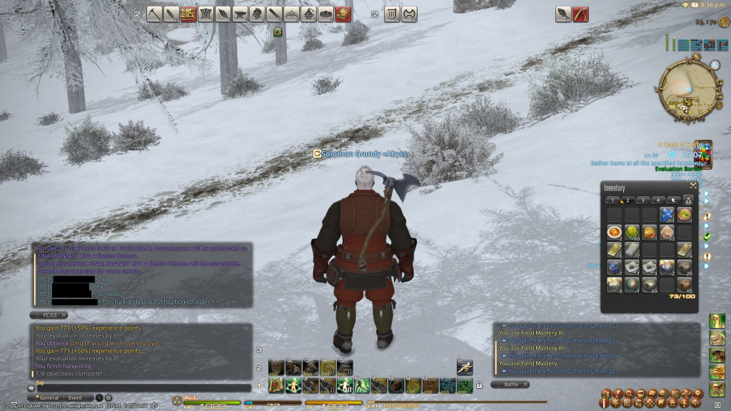 Steps: Carrying out the evaluation Botanist Leve “A Stash of Herbs” only 7 of the 8 harvesting points were available – the 8th is marked on the map, but no point is present, forcing me to abandon the leve. I logged out and back in and initiated the leve again about 20 mins later and the exact same error occurred. Please see two screenshots below (one for each leve). You can see the area highlighted on the mini-map but no harvesting point.
