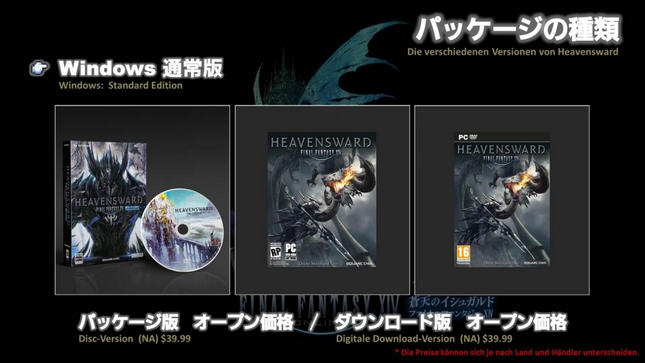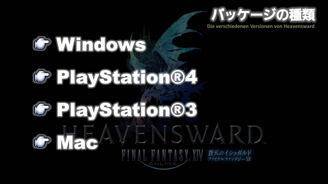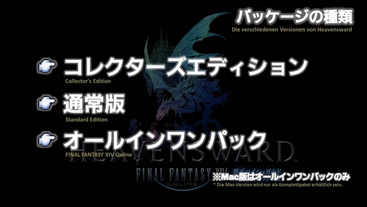 Außerdem gibt es drei verschiedene Packungsversionen: Die Collector’s Edition, die Standard Edition und die All-in-one-Version FINAL FANTASY XIV Online. In FINAL FANTASY XIV Online sind sowohl A Realm Reborn als auch Heavensward enthalten. Da die Mac-Version gleichzeitig mit der Veröffentlichung von Heavensward in den Handel kommt, gibt es sie nur als All-in-one-Version.