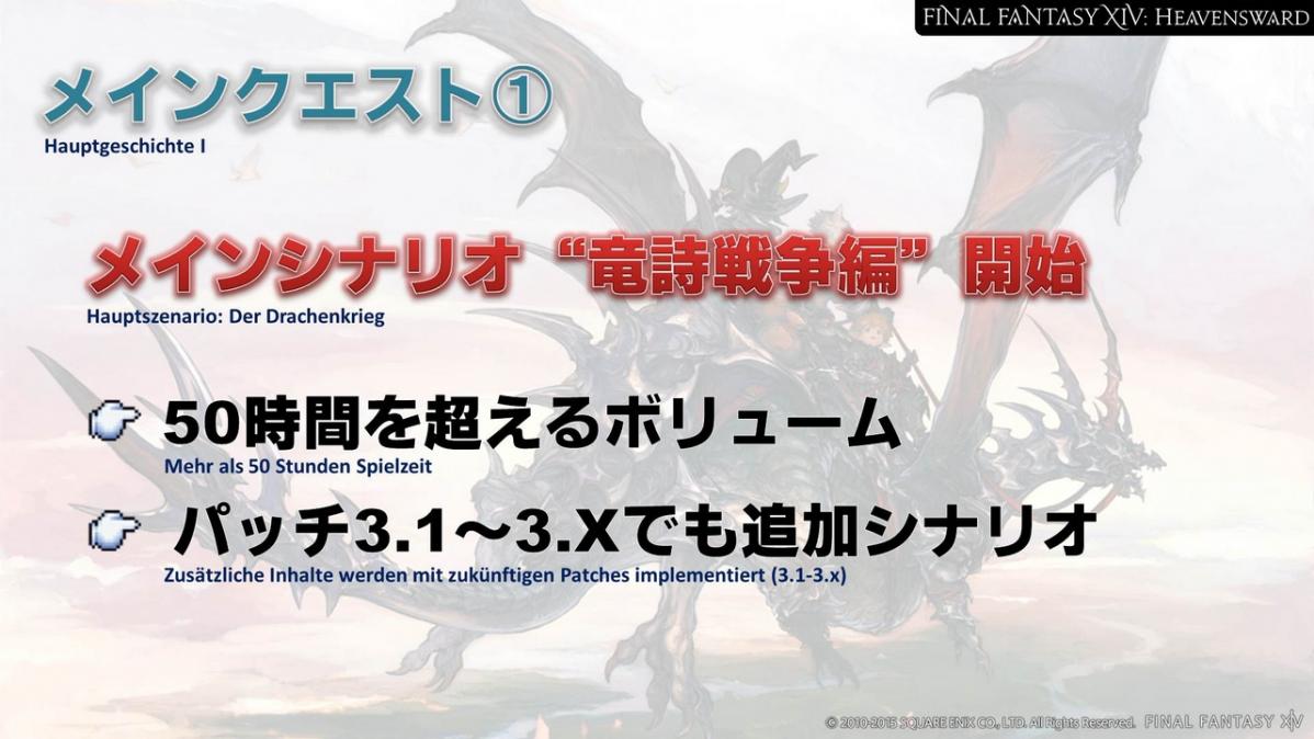 Die Geschichte um den Drachenkrieg beginnt mit 3.0 und umspannt in etwa so viel Inhalt, wie die Geschichte in 2.0 zum Zeitpunkt der Veröffentlichung. Wenn man die Zwischensequenzen nicht überspringt, benötigt man zusammen mit der Zeit, um auf Stufe 60 zu kommen, etwa 50 Stunden. Ähnlich wie in A Realm Reborn hat die Geschichte ein Finale, aber wird auch kontinuierlich mit den folgenden Patches erweitert.