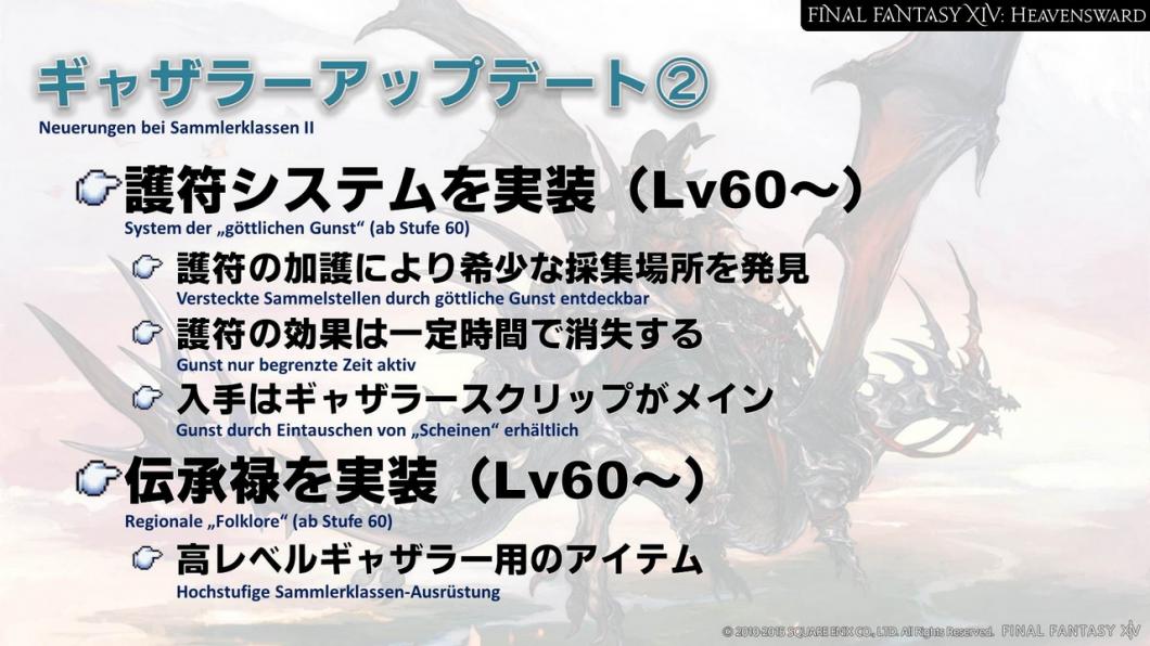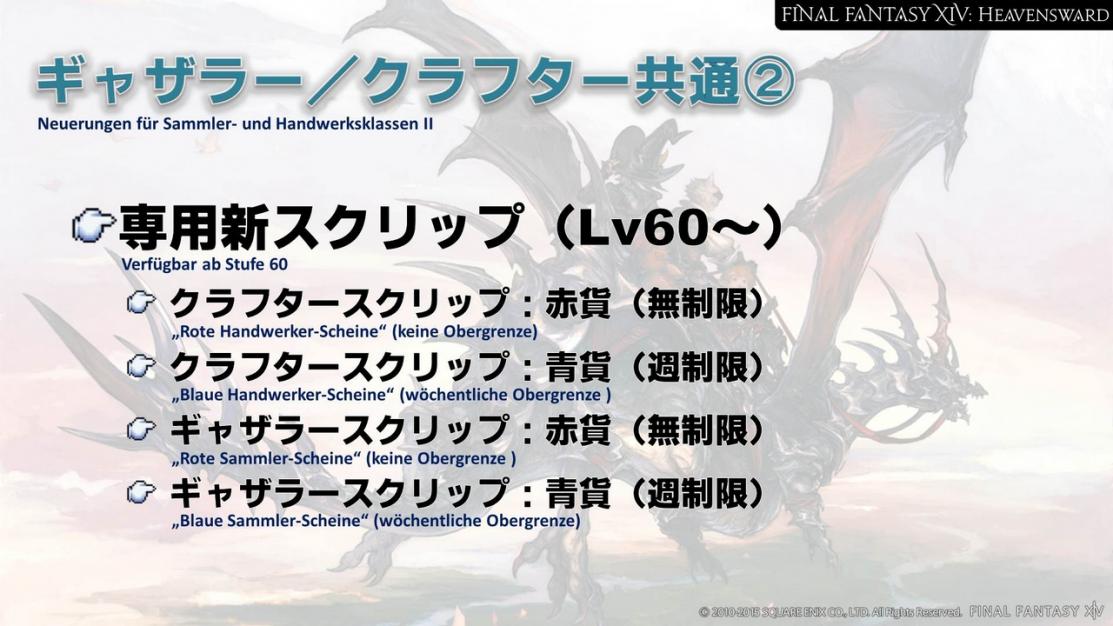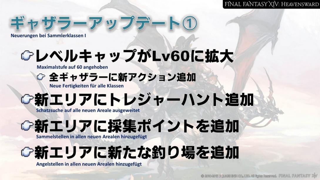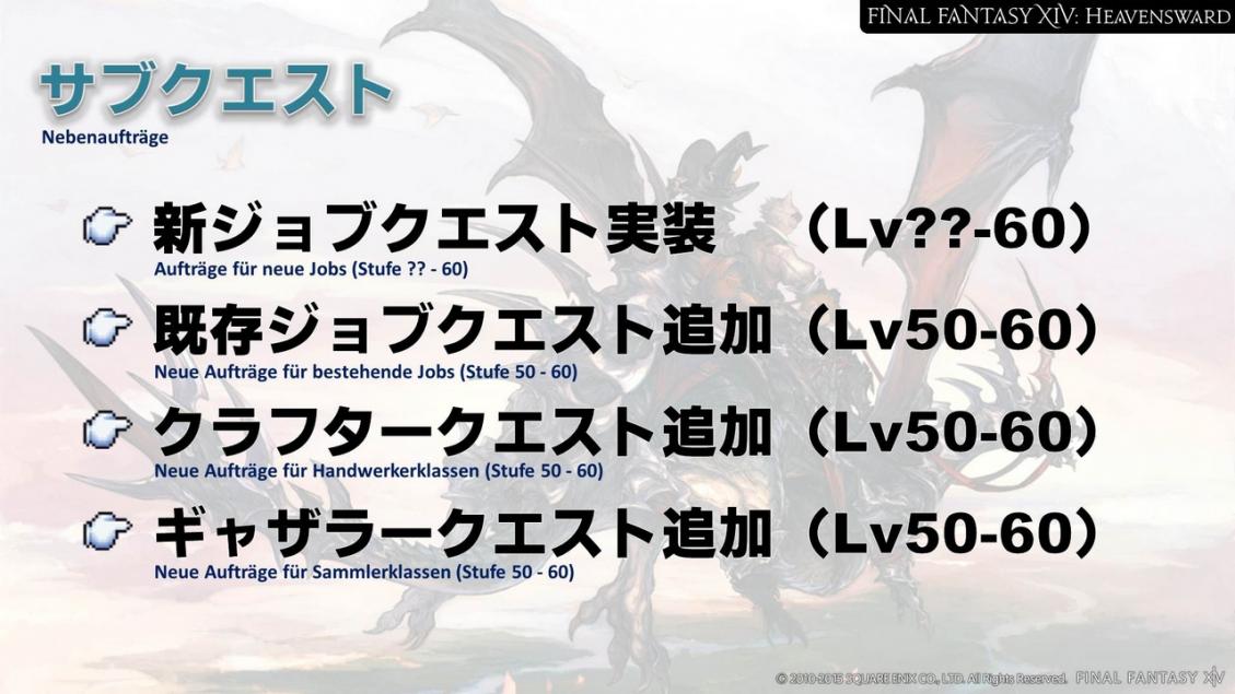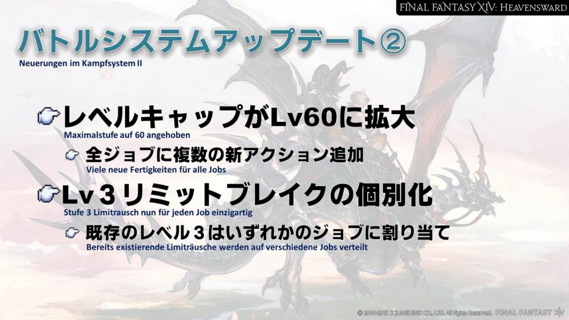 Die Maximalstufe wird für alle Jobs auf Stufe 60 erhöht und wir werden viele neue Kommandos implementieren. Man kann natürlich ohne die jobspezifischen Aufträge auf Stufe 60 kommen, aber die neuen Kommandos erhält man nur, indem man die Aufträge abschließt. Daher ist es ratsam, die Aufträge anzunehmen, sobald man die nötige Stufe dafür erreicht hat.