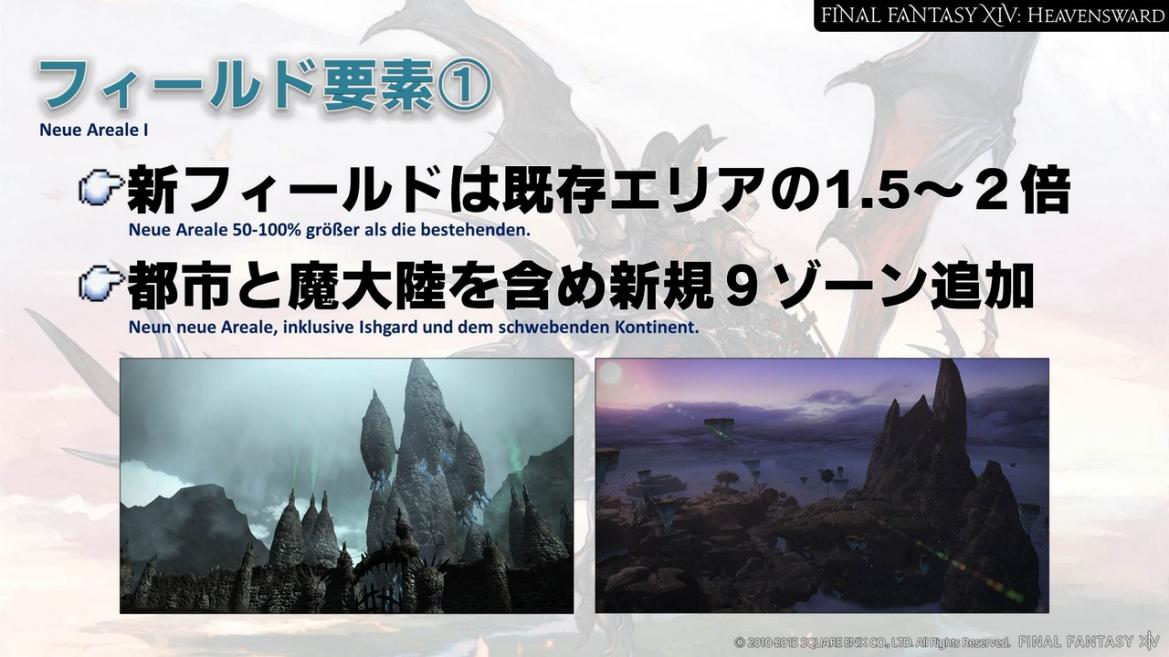 Die neuen Areale, die mit Heavensward eingeführt werden, sind etwa 50-100 % größer, als die Areale in A Realm Reborn. Zusammen mit Ishgard und dem schwebenden Kontinent, sind es insgesamt neun neue Zonen. Ich denke, ihr könnt euch nun vorstellen, wie viel größer die Welt wird, wenn ihr euch überlegt, dass neun Zonen hinzukommen, die alle mindestens 50 % größer sind als die existierenden. Einige von euch haben sich gefragt, ob der schwebende Kontinent ein instanziierter Dungeon wird, aber er ist tatsächlich ein offenes Areal. Seid schon mal gespannt, wie es dort aussieht!Attachment 1707