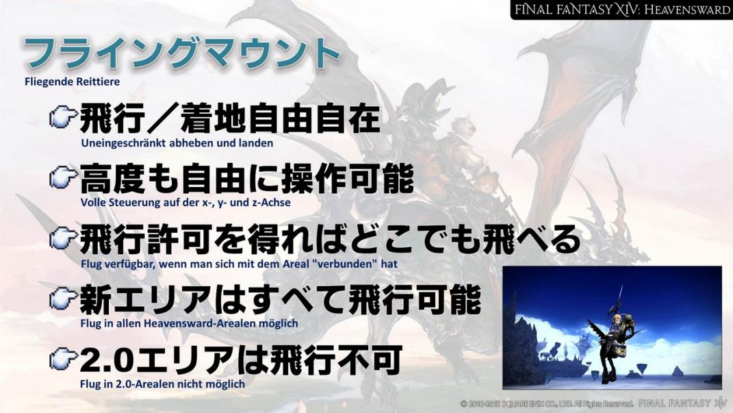 A: Das werden wir nicht mit der Veröffentlichung von Heavensward implementieren, aber wir wollen das auf jeden Fall anpassen. Dafür müssen wir Start- und Lande-Animationen für jedes Reittier implementieren und das braucht etwas Zeit. Aber irgendwann wird man mit jedem fliegenden Reittier auch tatsächlich fliegen können.