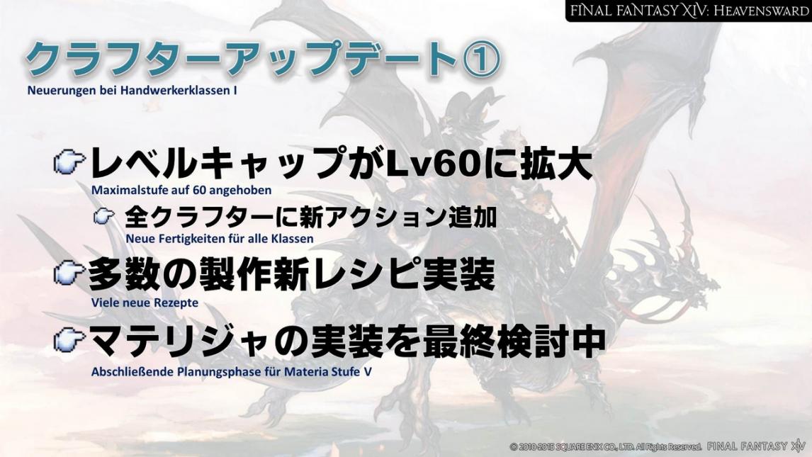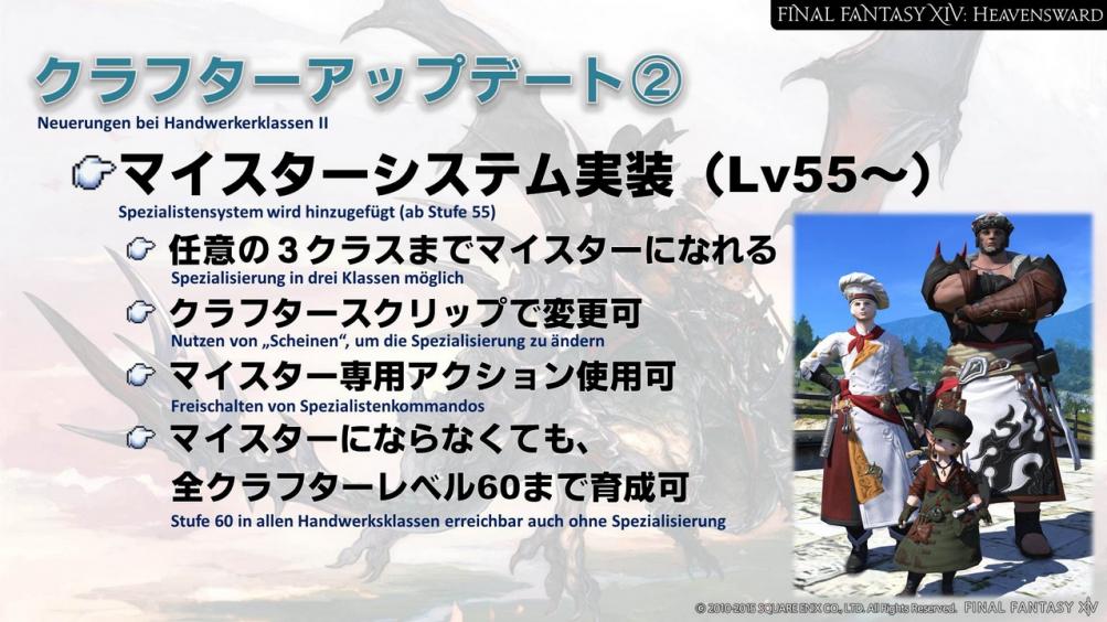 Die Maximalstufe wird für die Handwerksklassen ebenfalls auf 60 erhöht, und es kommen neue Kommandos für jede Klasse hinzu. Diese werden sich etwas von den neuen Job-Kommandos unterscheiden. Es gibt drei verschiedene Arten von Kommandos: Die, die man durchs Aufsteigen erhält, solche, die man mit der Erfüllung von Klassen-Aufträgen erhält und schließlich noch eine Art, die man durch die Spezialisierung in einer bestimmten Klasse erhält.