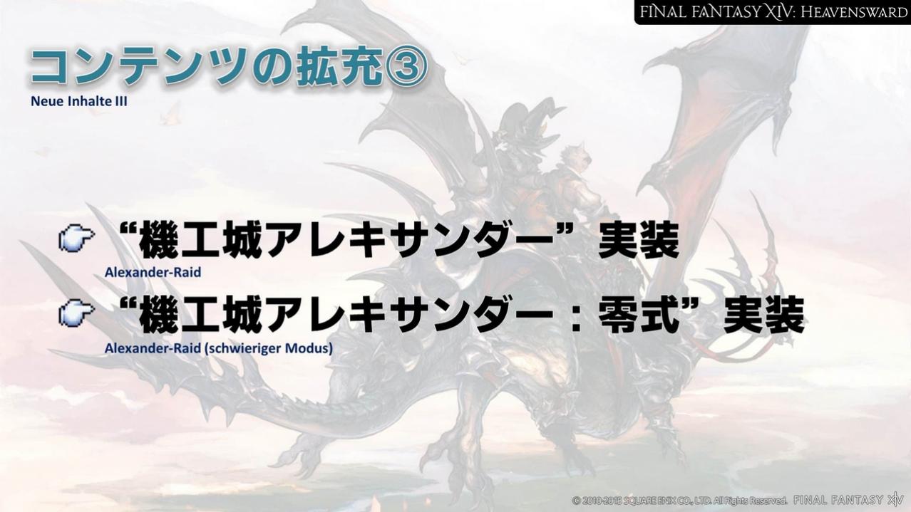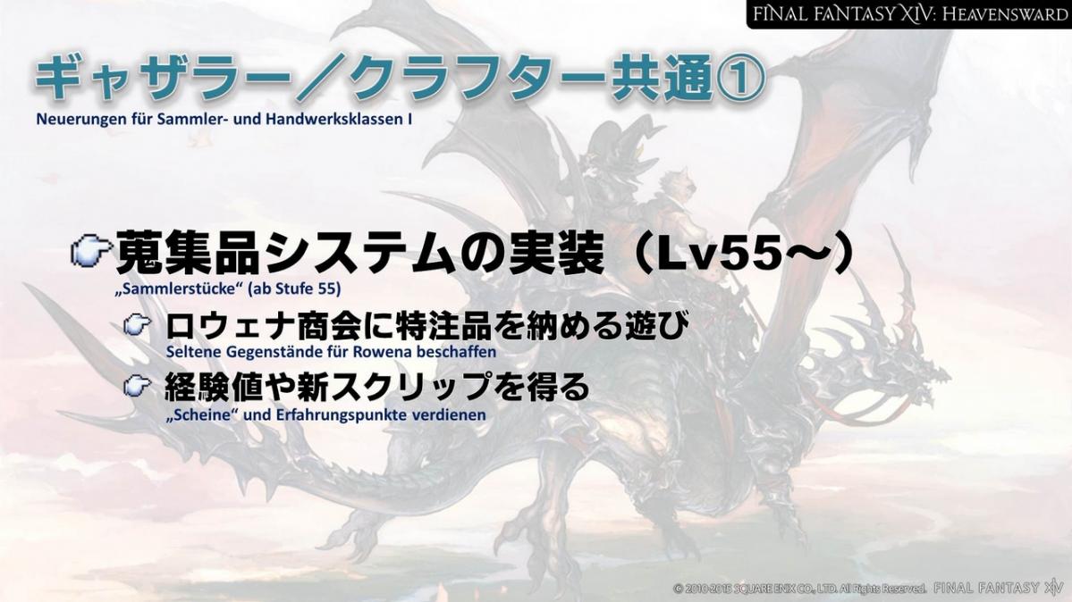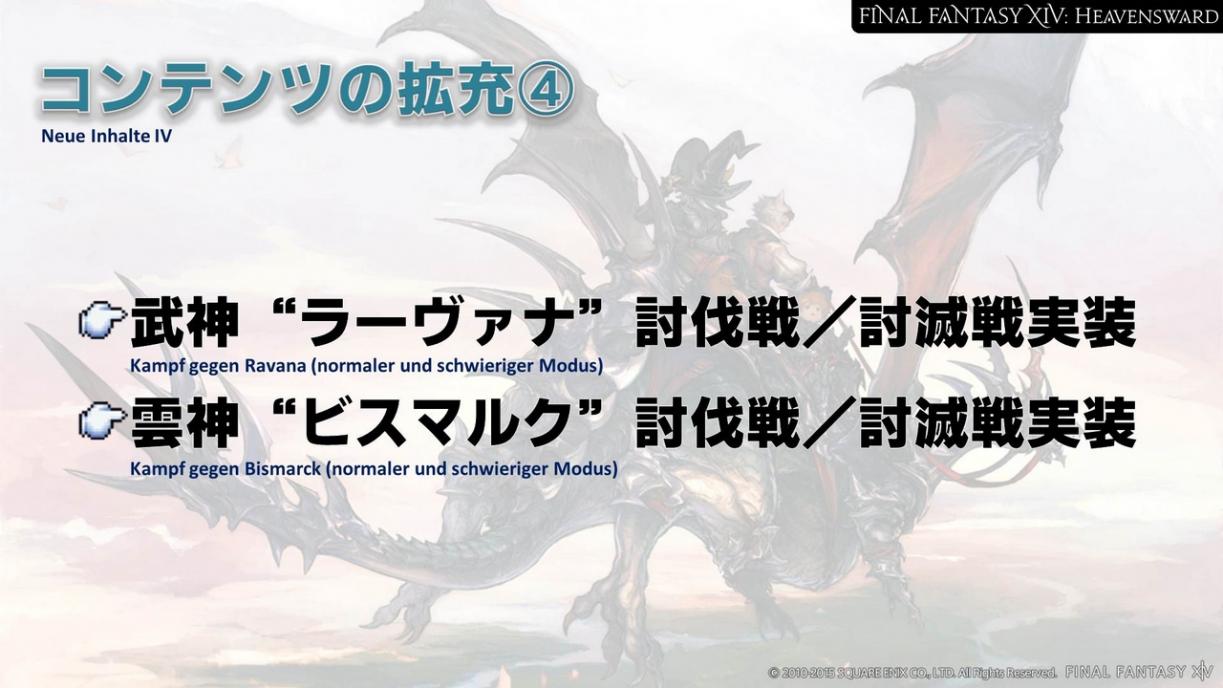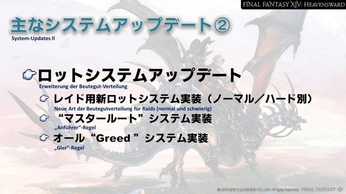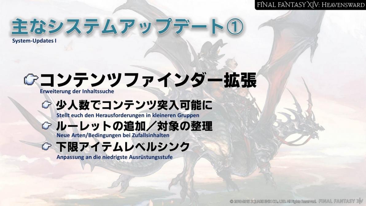 Zusätzlich haben uns viele Anfragen erreicht, die Limiträusche für die individuellen Jobs einzigartig zu gestalten. Auch das wird zusammen mit dem Update für Heavensward geschehen. Die bestehenden Limiträusche werden allerdings einigen der Jobs zugeordnet werden. Das heißt, dass nicht alle Jobs einen neuen Limitrausch erhalten. Einen Eindruck des Limitrausches der Dragoons erhaltet ihr, wenn wir den Heavensward Benchmark auf der Niconico Chokaigi 2015 veröffentlichen.