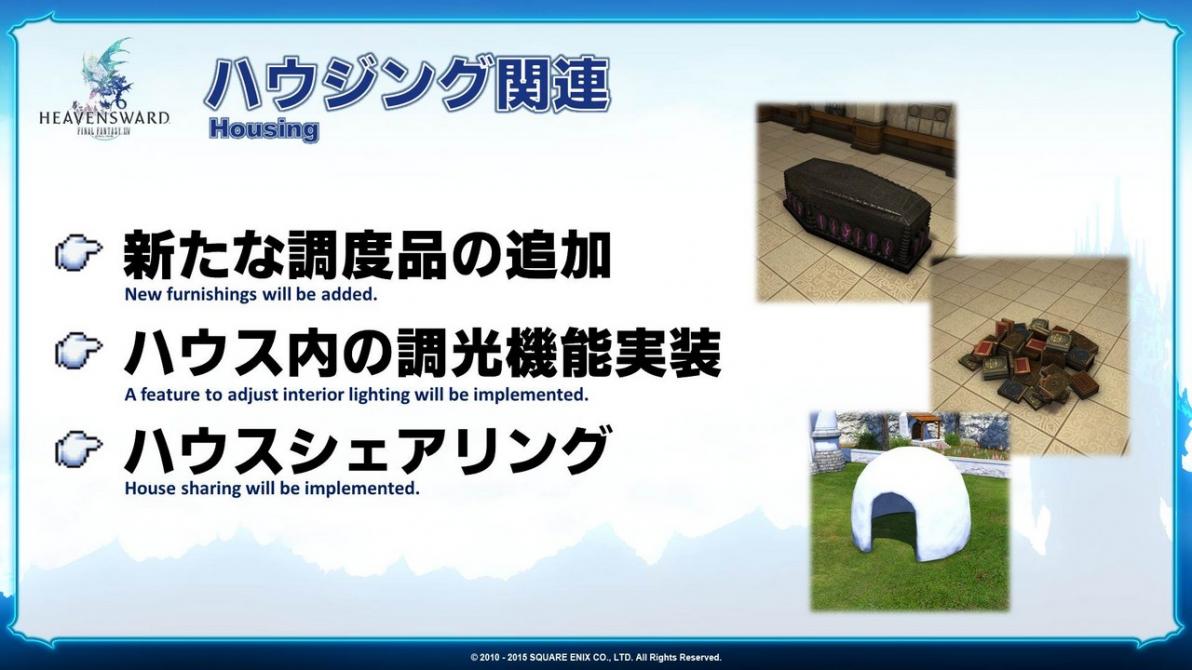 We’ll be implementing a feature that will allow you to adjust the lighting of the interior of your house. Also, we introduced house sharing during Tokyo Game Show, but we gave some incorrect information which I would like to correct. I mentioned that you could share between five others, but it’s three others – meaning yourself and two others.