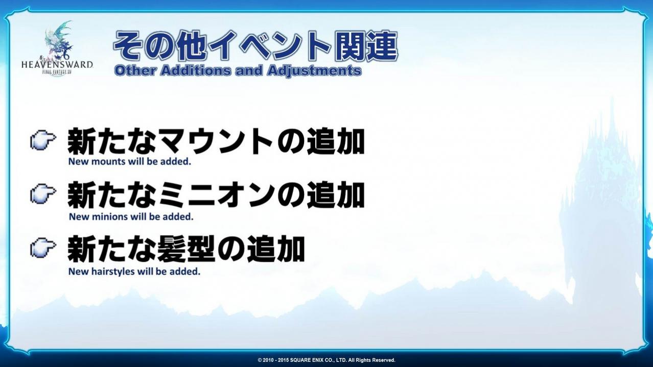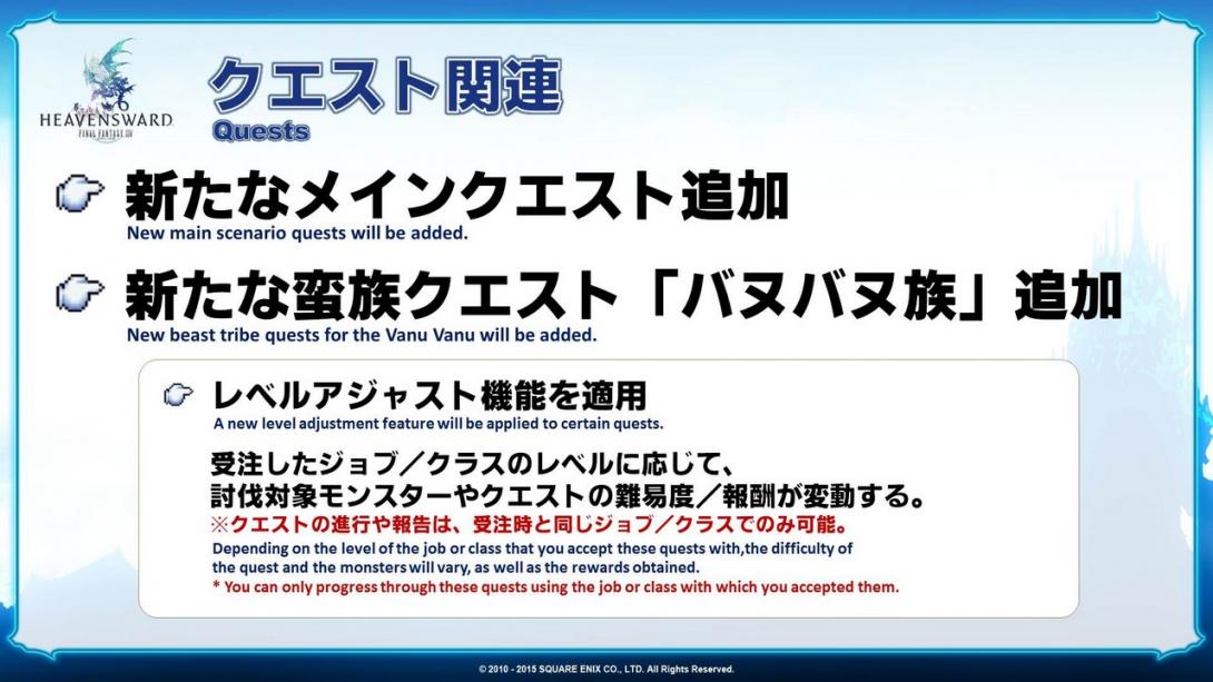 We’ll be adding new main scenario quests and they’ll feature Krile, the character you saw wearing the hood. I’m really surprised there were people that figured who she was just by looking at the picture we released earlier. I’m sure there are those of you who are curious about the naming convention since she is a Lalafell, but you’ll have to play through the main scenario quests to find out.