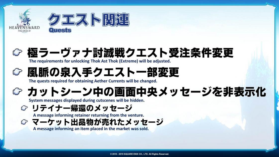 If you’ve ever received a notification that your retainer returned from their venture or your shards finally sold in Limsa during a really important cutscene, we’ll be making it so this doesn’t happen anymore. These two kind of notifications were being displayed quite frequently during cutscenes, so we’ll be displaying them similar to the login message.