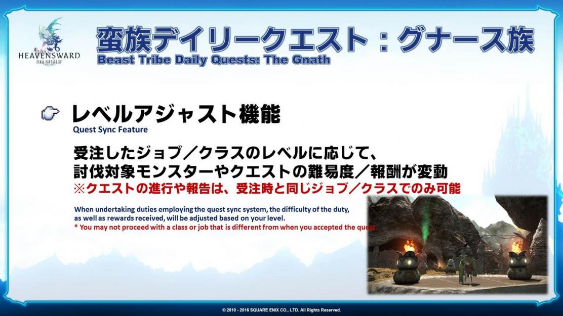The Gnath beast tribe daily quests will also make use of the level adjustment feature. While it's essentially the same as the system used in the Vanu Vanu daily quests, we plan on increasing the experience points rewarded. The Gnath stronghold will be near the "Vath Storyteller” NPC and of course there will be a mount that you can earn.