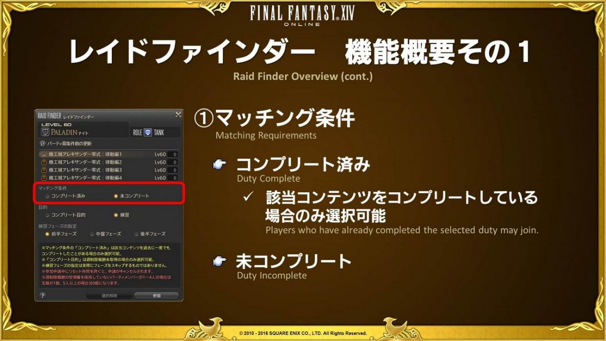 マッチング条件を最初に設定することができます。マッチング条件には「コンプリート済み」「未コンプリート」があり、挑戦するコンテンツを1度でもクリアしたことがある場合に限り「コンプリート済み」を選択できます。この判定はシステム側で行っているので、その層をコンプリートしていない場合は「コンプリート済み」を選択することはできません。