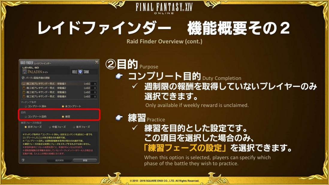 パーティ募集でもよくある「クリア目的でいきましょう」というパターンか、回数をこなして場慣れしたいので「練習」というパターンを選択できるとイメージしてもらうと分かりやすいと思います。