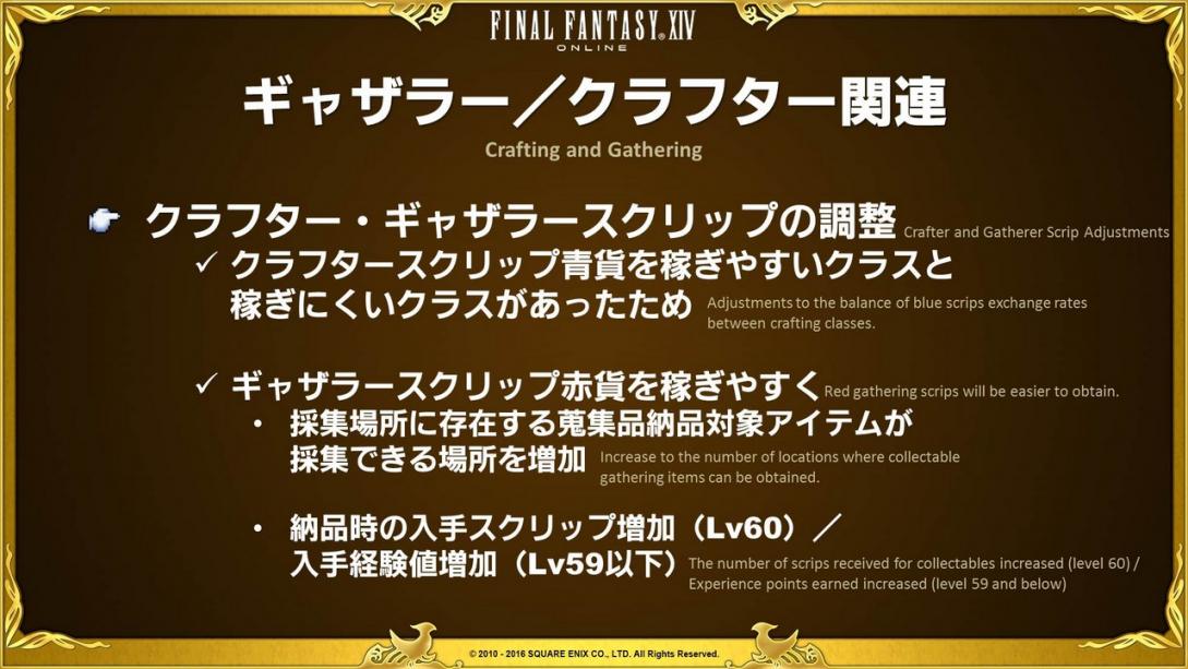 Since some classes had an easier time than others collecting blue scrips, we've made adjustments so that all classes should find it just as easy to collect them. We've also made adjustments so that it's easier to earn red scrips as well. Other general adjustments include, but are not limited to, increasing the number of gathering spots for the items used for collectables, increasing scrips earned when turning in items on a level 60 class, and boosting experience points when turning in items on a class which is level 59 or lower.