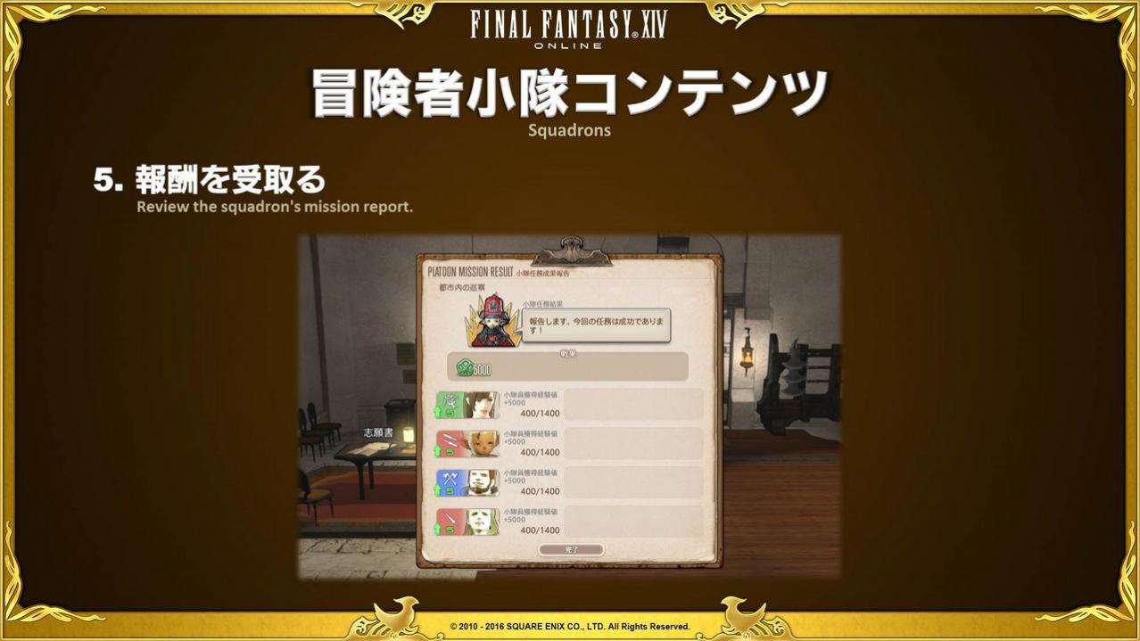 You'll gain a lot of experience points from completing missions, so each squadron member will level up fairly quickly. With that said, you'll also need to increase the squadron's overall attributes. We suggest unlocking squadrons when Patch 3.4 goes live. Players can now be promoted to first lieutenant in their respective Grand Companies, but in order to do so you'll need to increase your squadron’s rank to two.