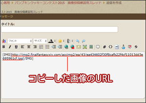 コピーした画像のURLを[IMG][/IMG]タグで挟み、投稿してください。
