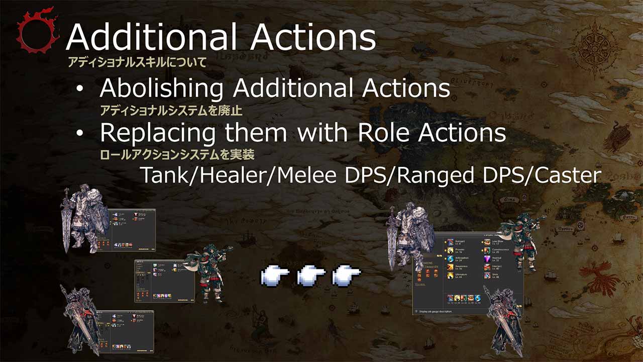 Up until now, players needed to level other jobs to obtain additional actions, and this has been confusing for new players. In order to resolve this confusion, we are abolishing the additional actions and implementing a new role action system. With role actions, players will be able to select five actions from a list of actions shared by their role which includes existing actions, as well as new actions. With the implementation of this system, players will no longer be required to level other roles to unlock their job. (For example, players are now able to become a paladin by just leveling gladiator to 30.)