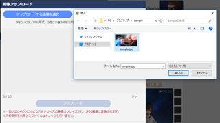 3.ページ中央に「画像アップロード」ウィンドウが表示されます。