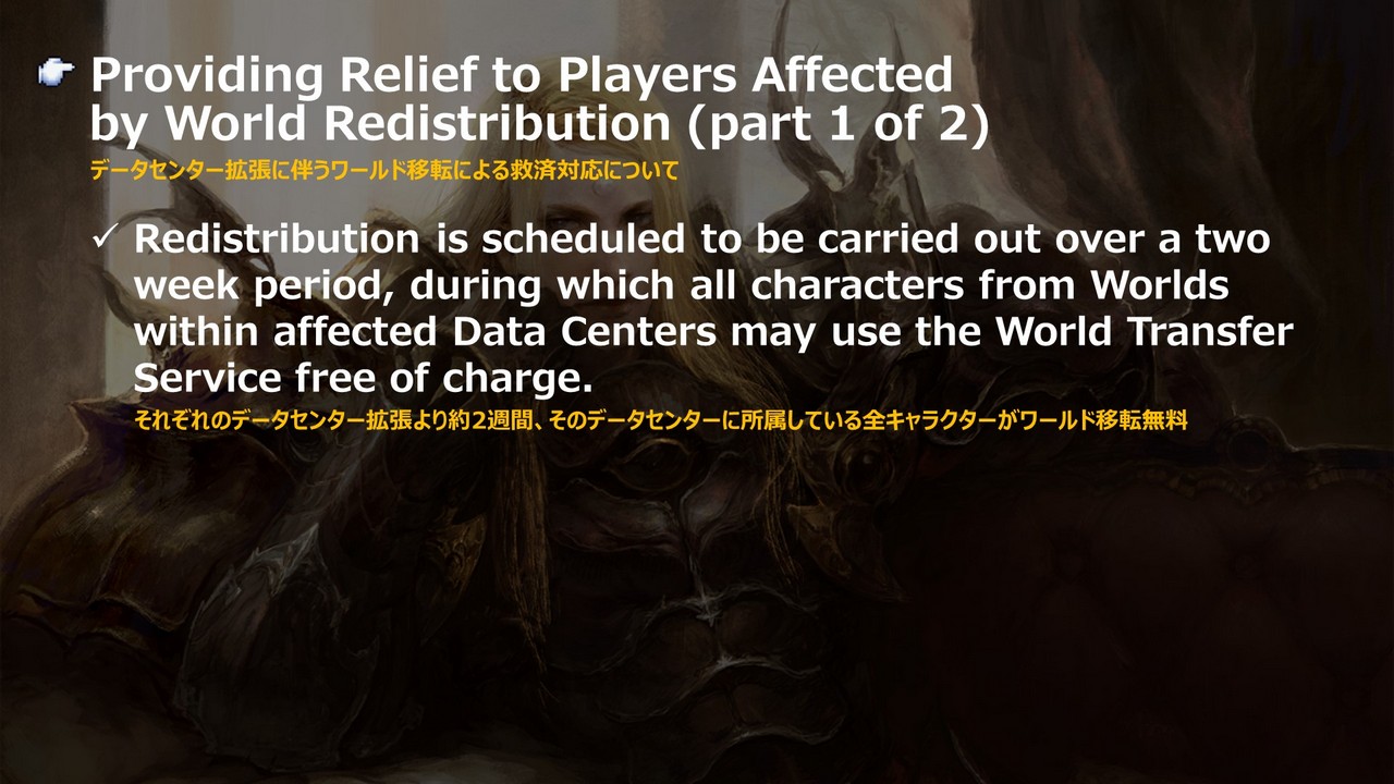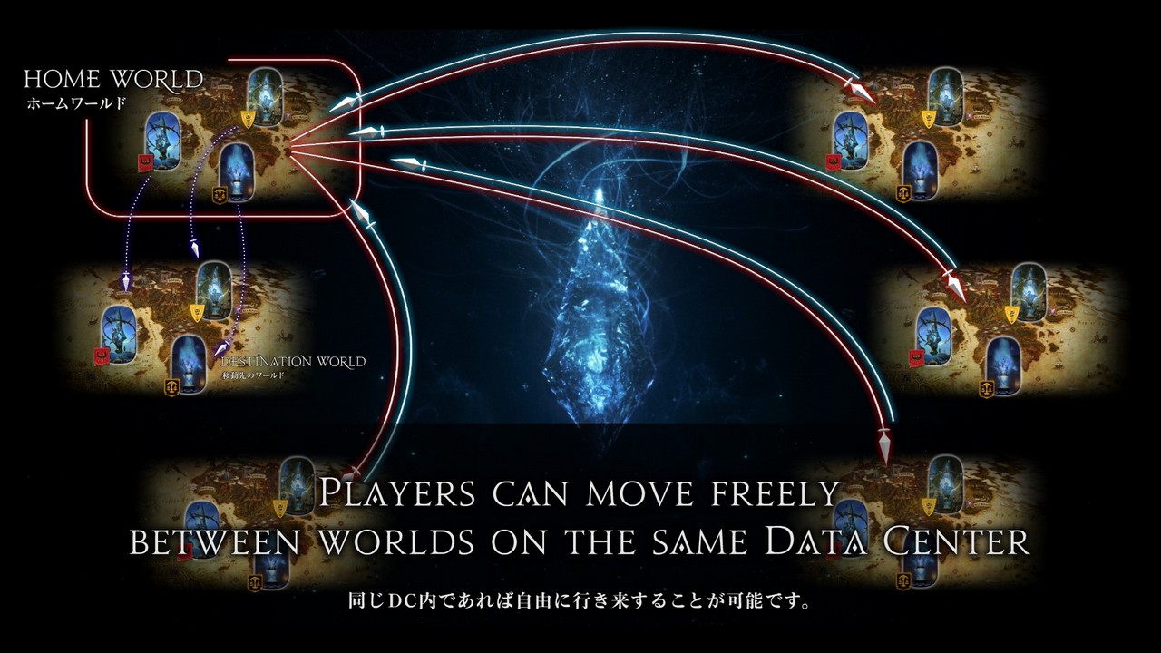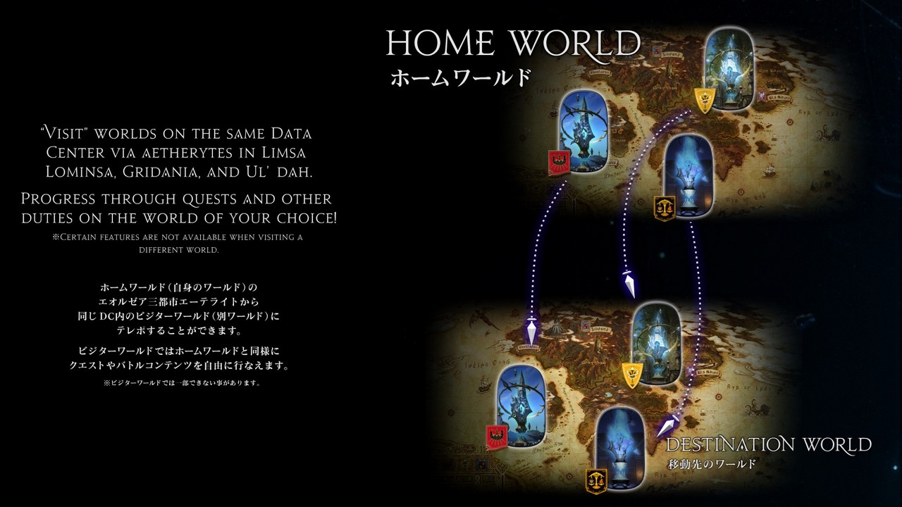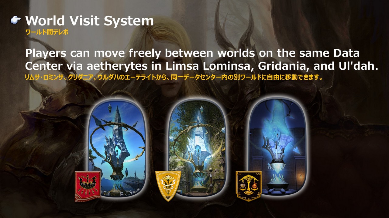 We're planning to introduce the World Visit system in the latter half of the Patch 4.5 series. With this system, players can move freely between Worlds on the same Data Center via aetherytes in Limsa Lominsa, Gridania, and Ul'dah. You open the subcommand menu by targeting the aetheryte, select your Destination World and the system will check to see how congested the Destination World is. If there aren't any issues, then you'll be able to visit that World similar to how you would enter a duty through the Duty Finder.