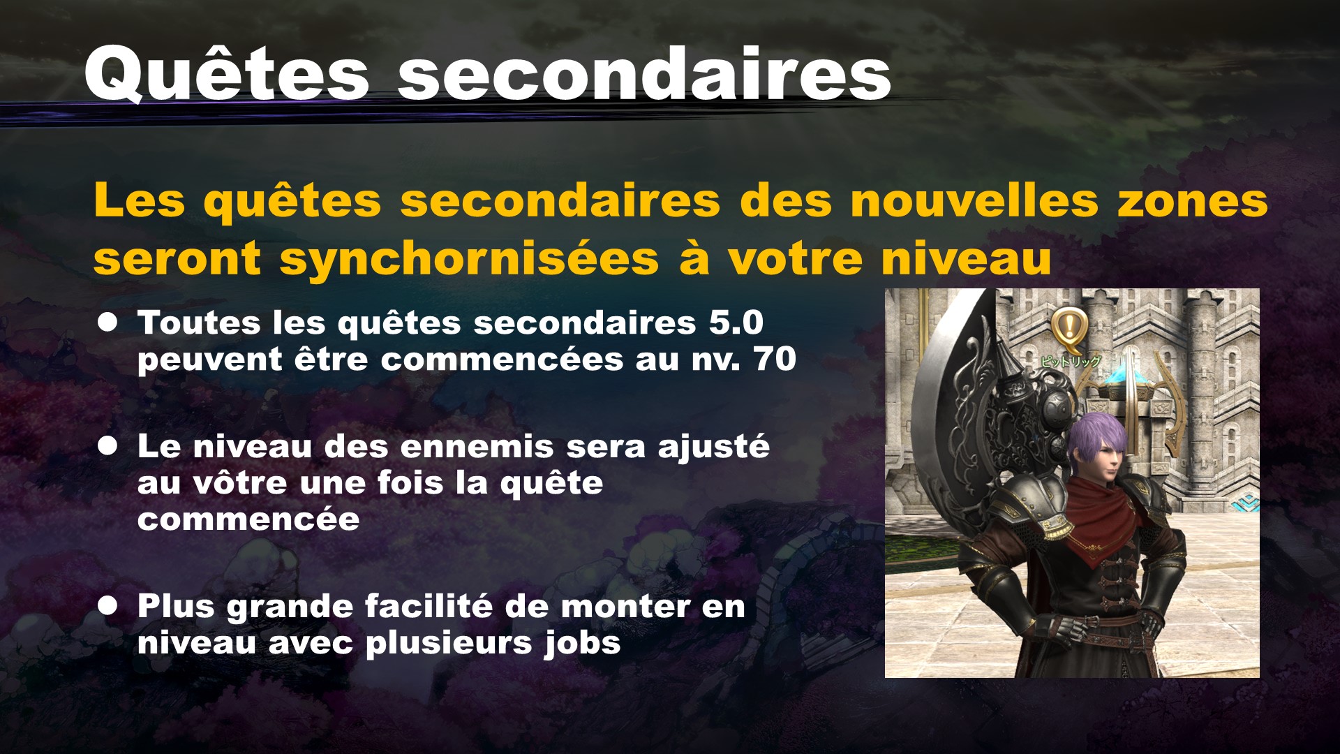 Toutes les quêtes annexes des zones de la 5.0 seront synchronisées à votre niveau à partir du niveau 70. De cette manière, vous pourrez en profiter pour faire monter en niveau vos classes secondaires.
