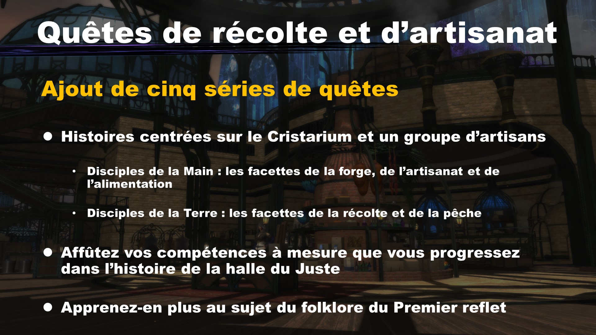 Ces nouvelles quêtes sont centrées sur le Crystarium et sont les nouvelles quêtes de classe pour les disciples de la terre et de la main. Puisqu’il y a un grand nombre de classes, nous les avons classées en cinq catégories, ce qui nous a permis de nous concentrer sur le développement de la qualité de chaque quête.