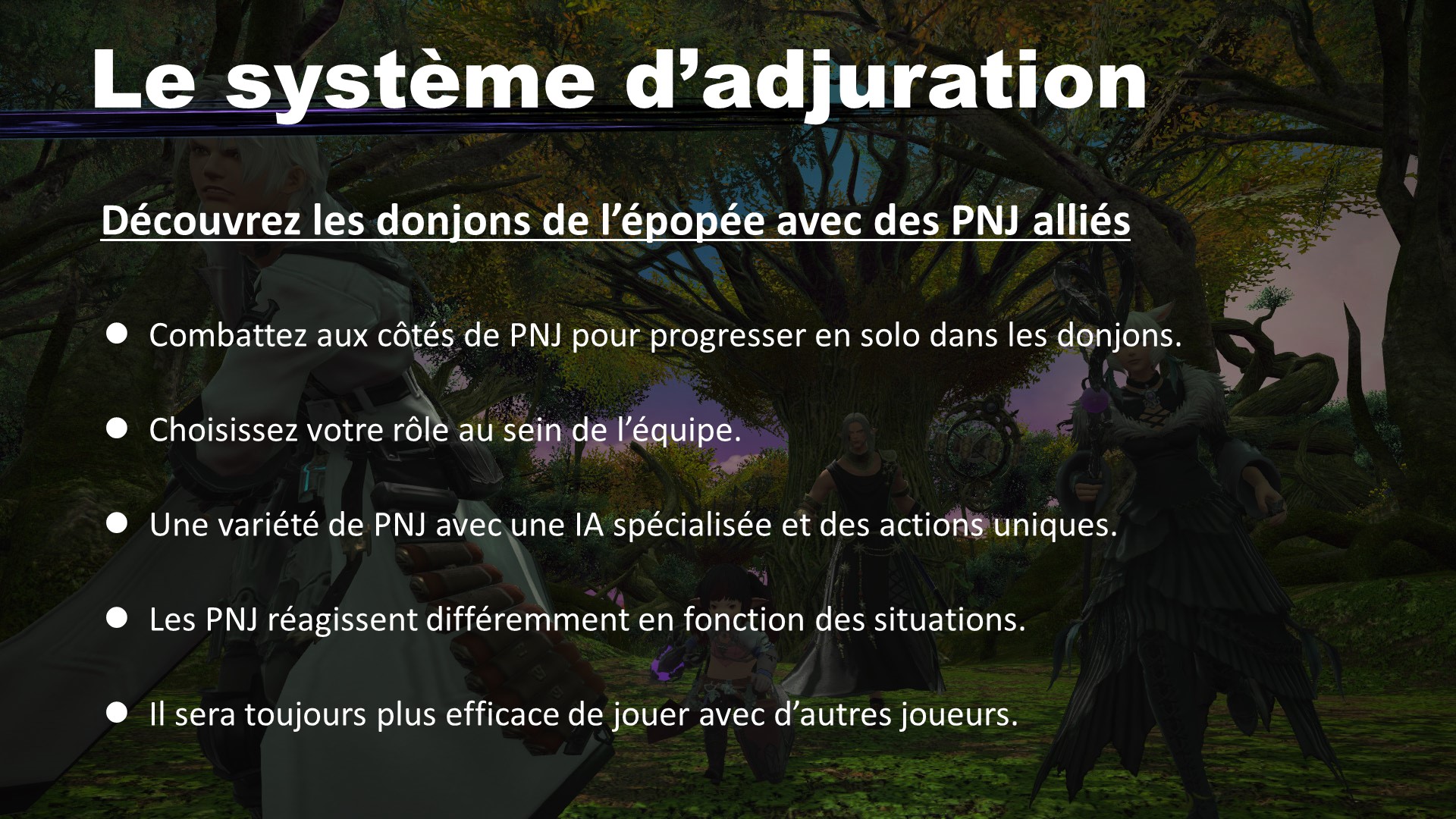 Le système d’adjuration vous permettra d’effectuer les donjons avec des PNJ. Vous pourrez participer avec n’importe quel rôle puisqu’il y aura assez de PNJ de chaque rôle pour satisfaire à la composition standard de petite équipe d’un tank, un soigneur et deux DPS.