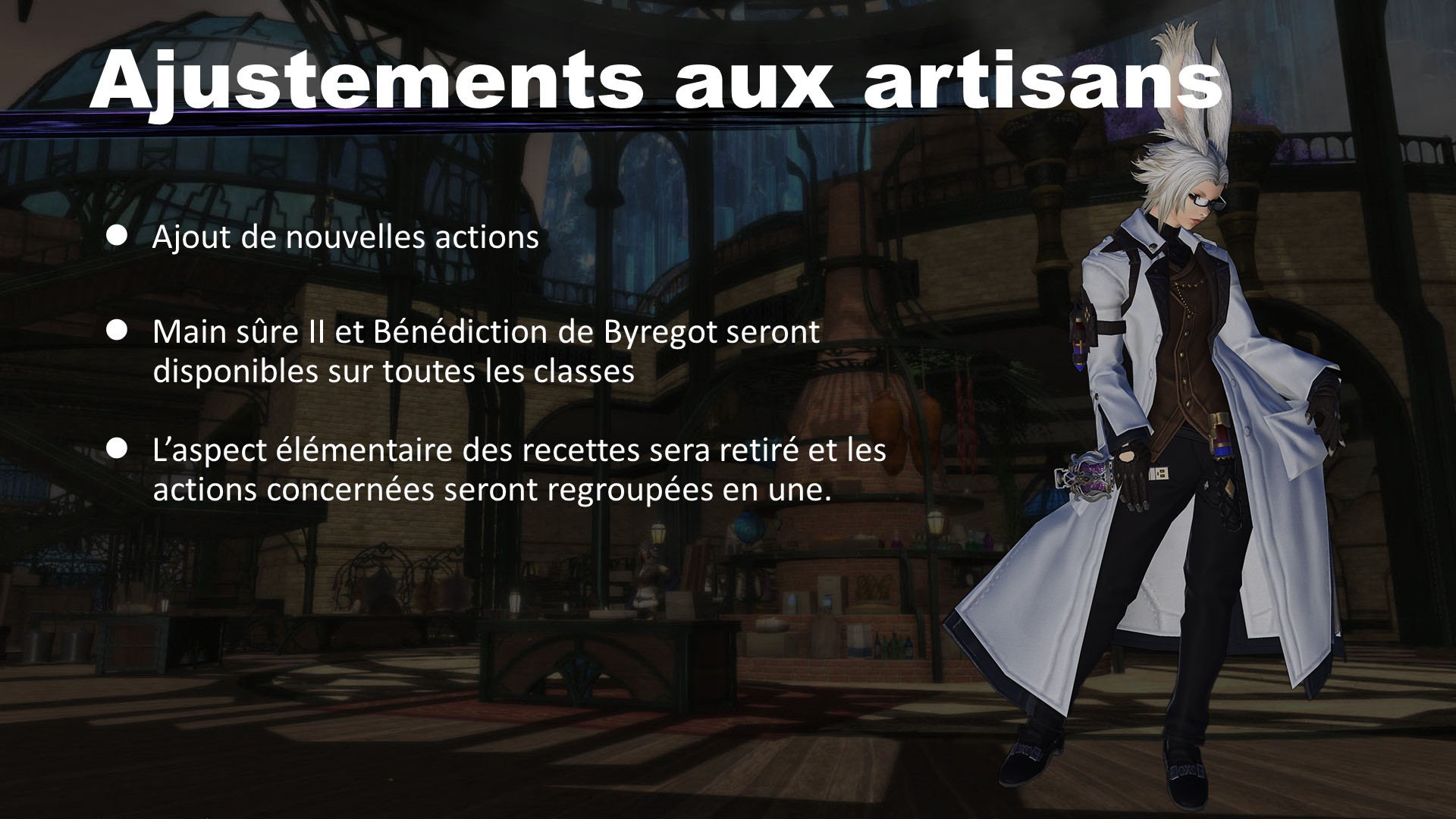 Les artisans bénéficieront de nouvelles actions, ainsi que de changements aux actions existantes. Par exemple, les actions Main sûre II et Bénédiction de Byregot seront désormais disponibles sur tous les jobs d’artisanat en raison de leur importance, même lors de la montée en niveau. Nous voulons donner une chance à tous les nouveaux joueurs de commencer l’artisanat avec n’importe quel job.
