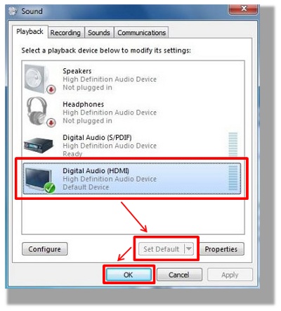 - Select the appropriate device under the "Playback" tab, select "Set Default," and then select "OK."